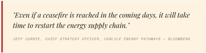 The 400 barrels is not the most important thing for global energy stability, it is the reopening of the Strait of Hormuz. The 400 barrels are a financial tourniquet being apply to structural wound. As Jeff Currie put it, “Even when this ends the energy supply chain will take months to restart. The pipelines, the logistics networks, the contractual relationships, all of it gets scrambled when conflict freezes the system. The war’s economic half-life extends well beyond any ceasefire.”