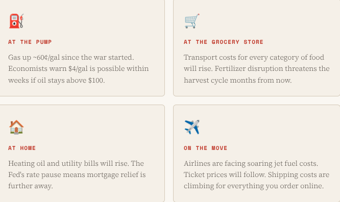 American households spend an average of $2500 per year or $50 per week filling up their cars. A 20% increase in gas prices adds roughly $10 a week to that bill. That may sound modest but economists at Evercore ISI have calculated that if oil stays near $100 a barrel, the resulting cost will effectively wipe out the benefit of tax refunds for most American households this year and only the top 30% of earners still coming out ahead. For those below that line a tax cut is a wash at best and a loss at worst.